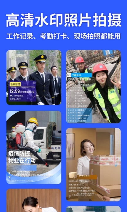 标记相机可自定义水印相机时间和地点,可用于拍照、打卡、值班巡检等。内置时间地点水印、天气水印、经纬度水印、电子钟水印、工程水印、值班水印水印、保安巡更水印特点: