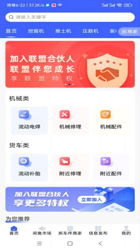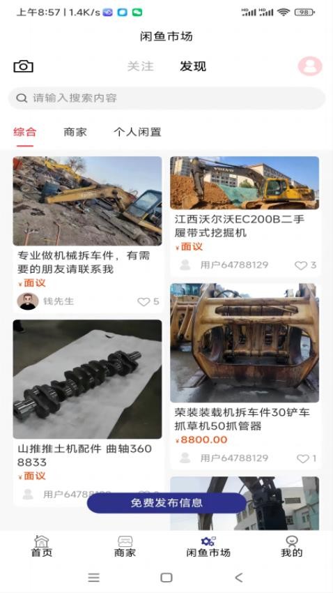 1、是一款为用户提供各类机械租赁、交.易信息的软件。软件中提供了免费的鱼市场,用户可以在闲鱼市场中心找到各类机械交.易和租赁信息。