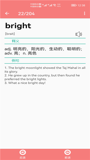 每天都能够在这里进行单词的背诵,给大家带来了多种多样的单词语音,你能够了解每一个单词的读法,快速的在这里进行背单词挑战,制定一个属于自己的背单词计划,大家可以按照规定完成任务,养成一个非常好的英语学习习惯,提供特别全面的单词释义,了解每一个单词的使用方法。