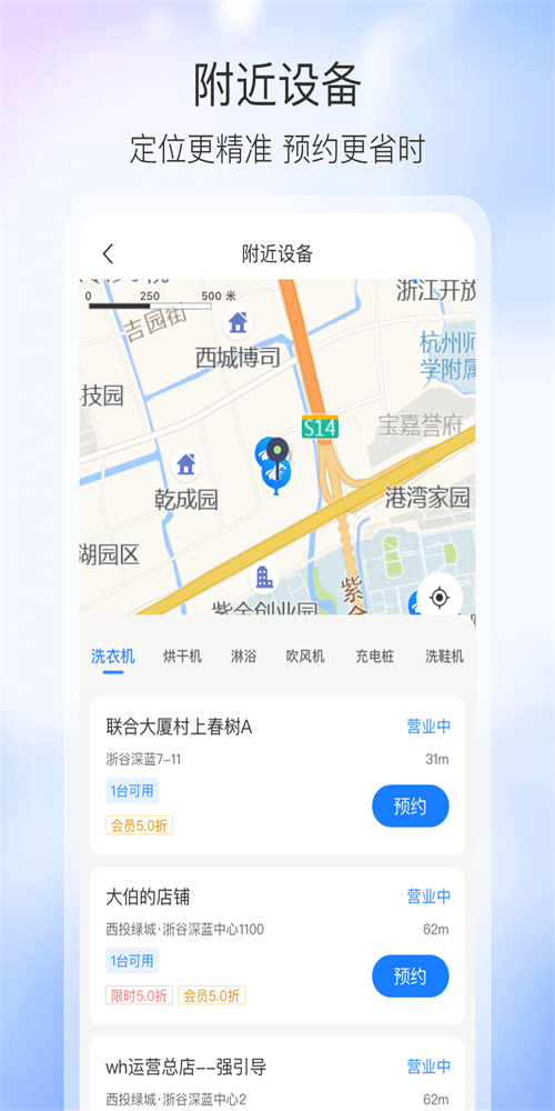 *轻松预约:用户可以轻松预约附近洗衣、饮水、淋浴等共享设备,不再担心设备被占用的问题。