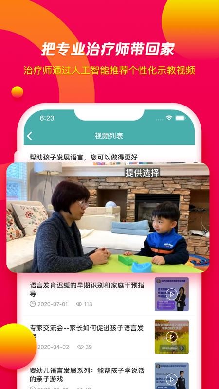 1、带专业治疗师回家,治疗师通过人工智能推荐个性化教学频。