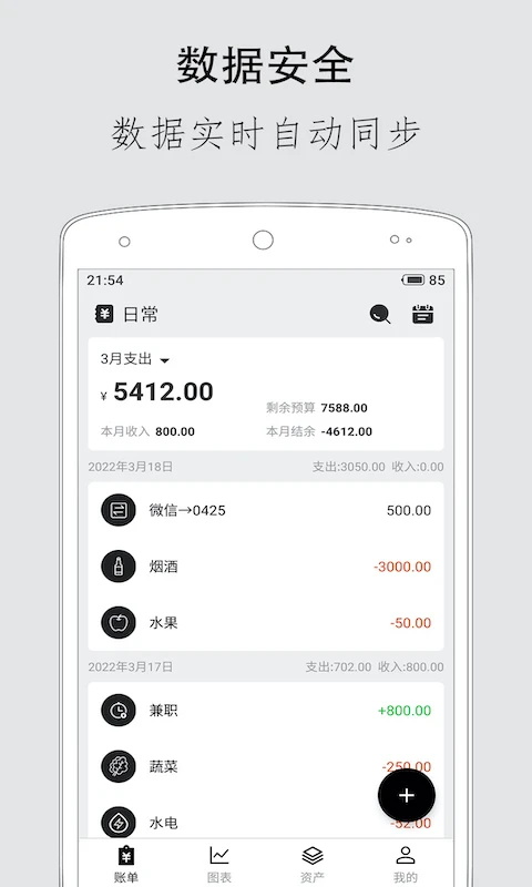 *简洁的图表模式,清晰地展示日常开销和工资收入情况,让用户一目了然。