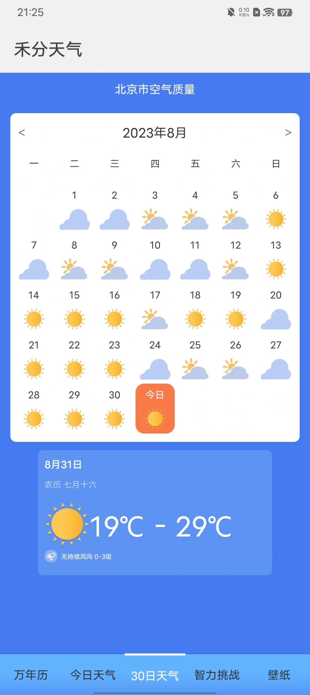 禾分天气是一款能为用户提供天气预报和高清壁纸的应用软件,使用该软件的用户了获取每个月的天气预报情况和日历日期,提供了多种不同风格高清主题壁纸免费使用体验,用户还能体验到各种有趣益智类型的小游戏玩法等,内容十分丰富多样,感兴趣的用户欢迎来下载体验吧。