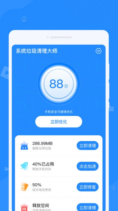 系统垃圾清理大师软件是一款专为手机用户打造的优化工具,为用户提供了一键清理垃圾功能,能够帮助用户清理手机存储空间,并且为用户提供了优化功能,能够帮助用户自动优化手机中的各项应用以及文件,且支持多种清理模式,用户能够根据自己的不同需求来选择。
