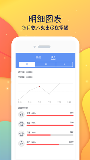 彩虹手账是一款非常好用能明细记录用户每月总收入和消费信息图表的工具软件,使用该软件的用户可自定义的规划个人的消费信息和设置收入来形成专属个人的手账数据统计表,用户将可以可以一目了然的来获取个人的账户资金情况,用户将可以统计到每天到每月的详细的收入消费的统计。