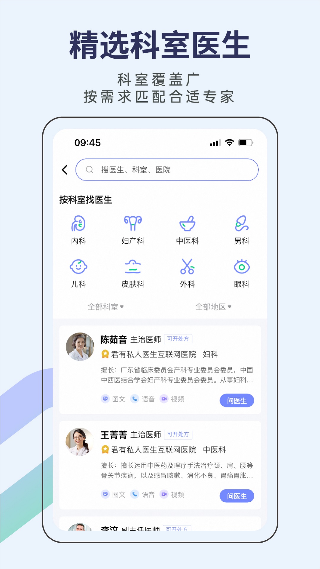 君有好医生居民端是一款专为居民拥有所提供的医疗服务便民的平台软件,软件内有着非常专业的医生提供医疗咨询服务,可选择你需要咨询的科室来精准的找到医生,定位位置来获取周边附近的医院和查询最热门的医生推荐服务,为用户提供了绿色医疗通道和可预约医生和医院的便民服务。