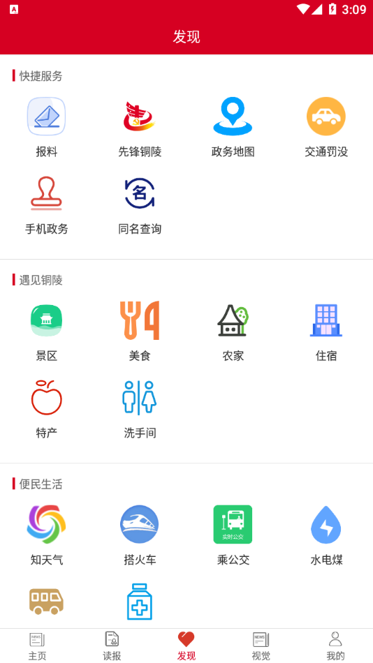 1、是铜陵日报社制作,软件拥有新闻资讯,读报,发现,视觉等等内容板块。