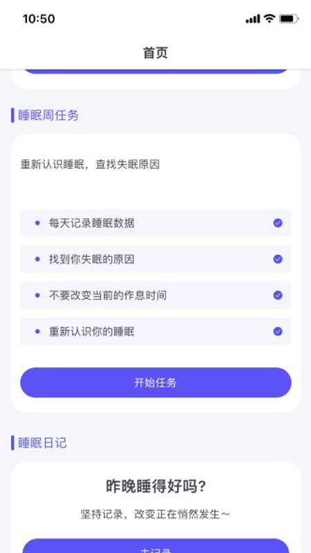 1、【睡眠周任务】将睡眠认知行为疗法数字化,循序渐进地帮助用户通过系统科学的方法改善睡眠情况