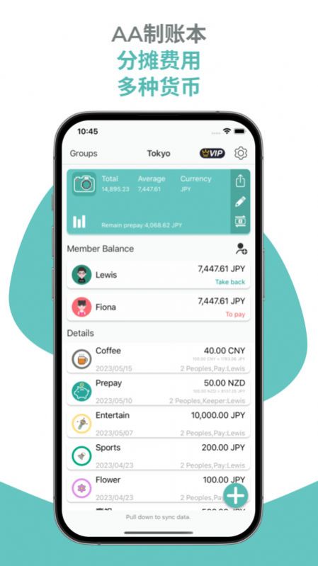3、AA制账本,随时记录分摊费用,支持不同的货币记录哦。