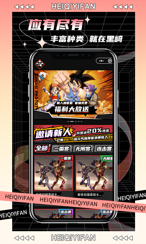 黑崎一番是一款商城手办购物盲盒玩家的服务平台软件,软件内的用户将可享受新人专属的优惠福利礼包,海量的盲盒类型资源可提供抽赏购物体验,详细的类型分类和专区,应用仅有,种类丰富,用户将有机会获得各种隐藏款和大赏等性价比福利,而且都可以保证每次的抽盲盒都能中奖。
