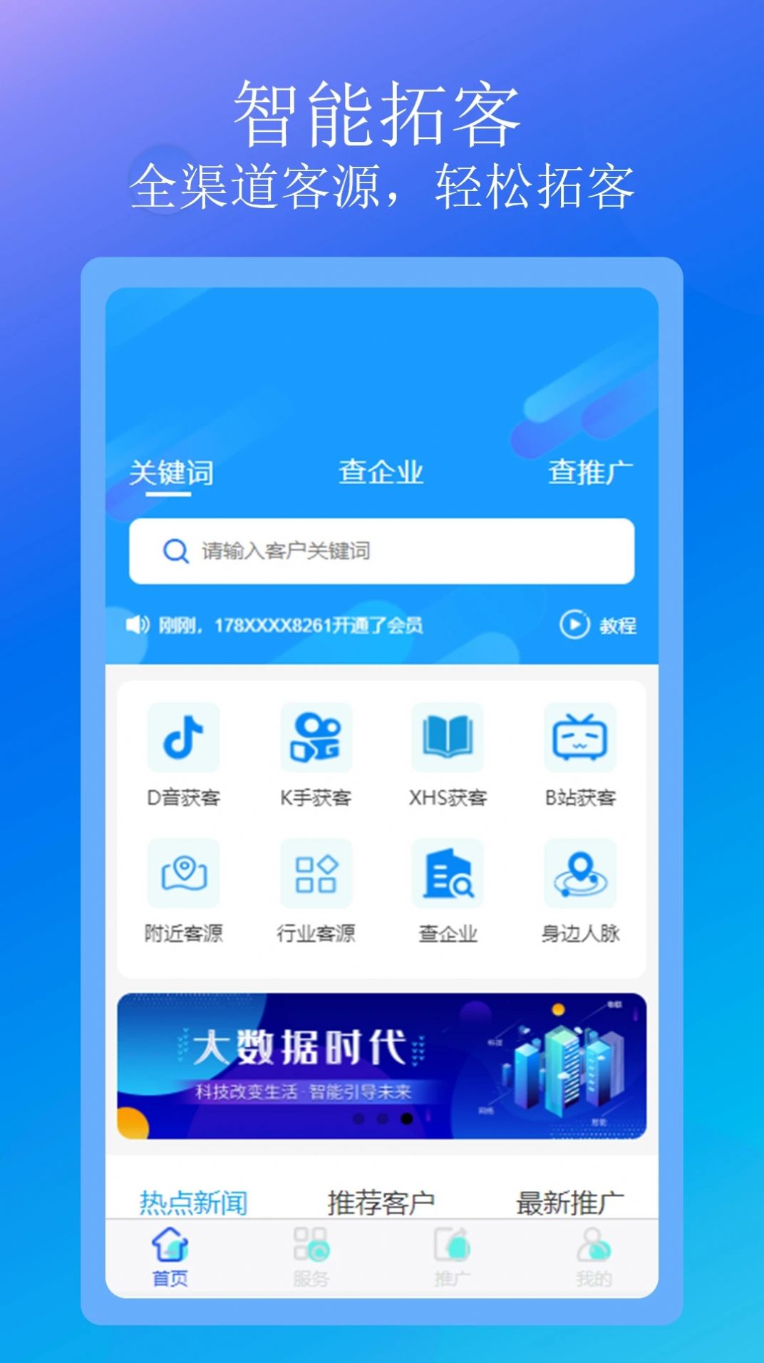3、提供智能拓客服务等,全渠道客源,轻松拓客的工具。