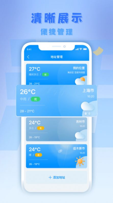1、城市天气一键掌握,不同的城市天气都会实时变化;