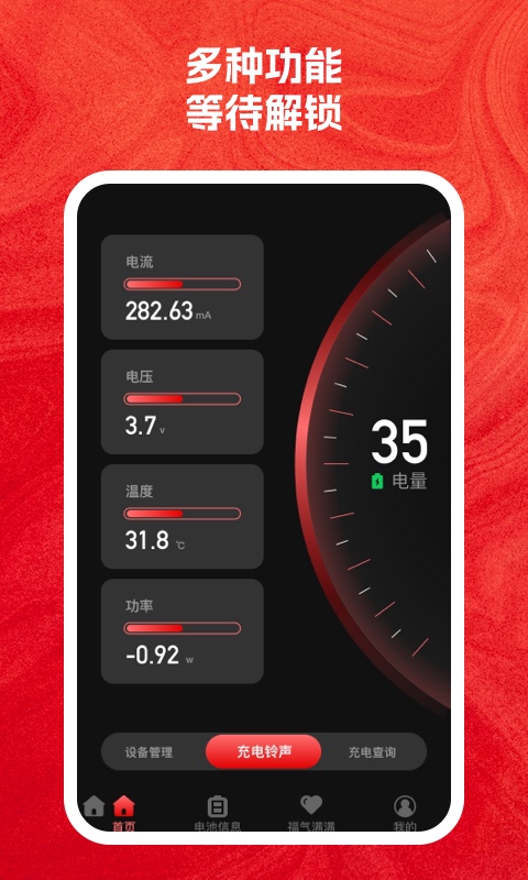充电得福是一款很专业好用能实时检测手机电池健康寿命的应用软件,该软件提供了丰富的多功能选择,可以进行电池的测试检测诊断修复功能,能实时的获取手机所占用的空间数据情况,了解电池能充电的最大支持功率,可以给电池一键降温的功能,还能精准的测试出电池的电流和电压。
