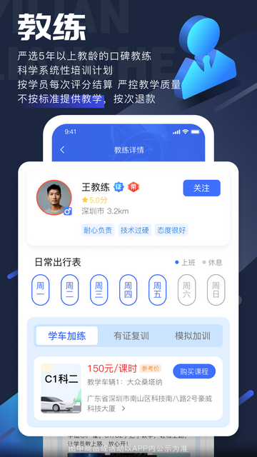 2、简便预约:自主更换教练,保障学员学车进度,结束后对教练作出评价