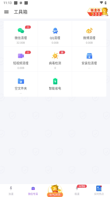 2、不会使其处理卡顿的状态。这里支持微信、qq专区清理,能够对其进行单独的垃圾清理和优化
