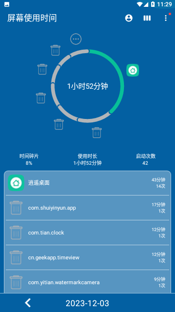 屏幕使用时间是一款能实时检测手机屏幕使用时间的应用软件,这款软件能智能检测到用户的入睡时间、起床时间、手机屏幕使用时间等来进行检测记录,能购物实时掌握所消耗时间长的应用,了解每天总的手机开启次数,能够详细的记录每一次的时间和生存详细的数据统计表功能。