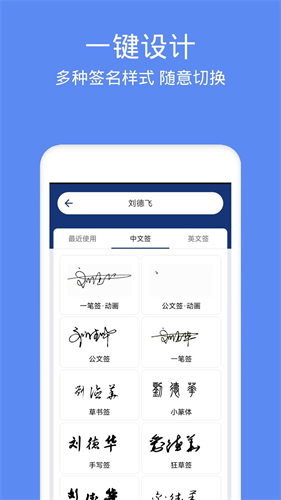 一笔签名、公文签名、动画签名、英文签名、潇洒签名、卡通签名等几十种签名样式随意选择,支持多种风格样式签名设计。