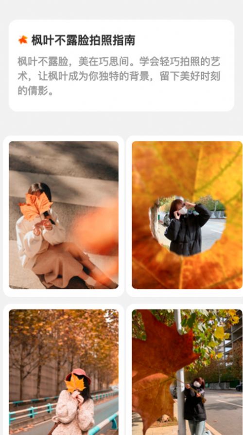 2、可以学习各种枫叶场景下的拍照动作指南。