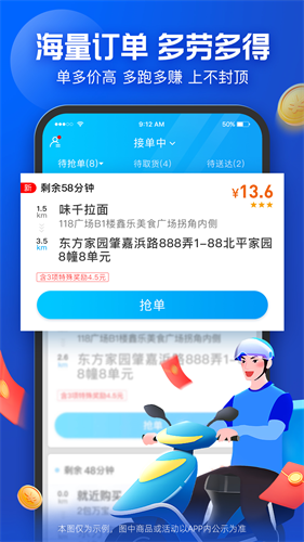 通过软件轻松获取周边商家的运单,抢单、取餐、送餐,只需三步就能获得丰厚收入。
