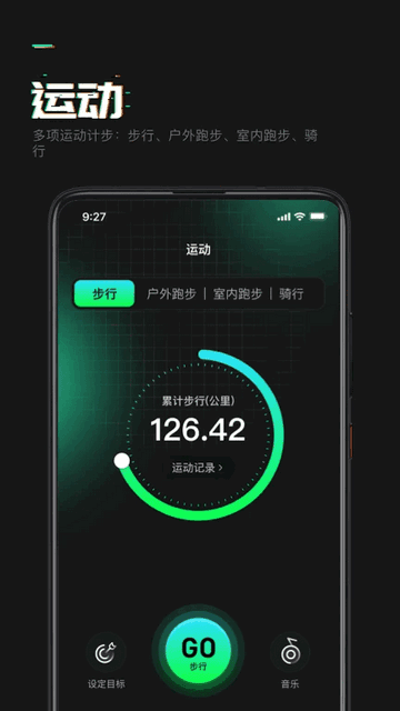 精准记录每天的运动步数和时间以及自己设置的目标完成率查询功能。
