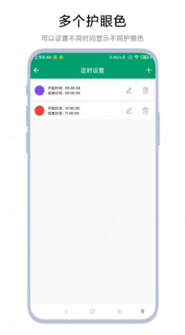 定时护眼色是一款能自定义调节屏幕颜色护眼模式功能工具软件,这款软件能自定义设置定时切换功能,可以筛选喜欢的主题颜色和调节透明度功能来进行屏幕颜色调整,一键护眼,不管是在白天还是晚上都能让用户拥有一个更好的看屏幕的效果,可自定义的创建多个定时时间来完成设置。