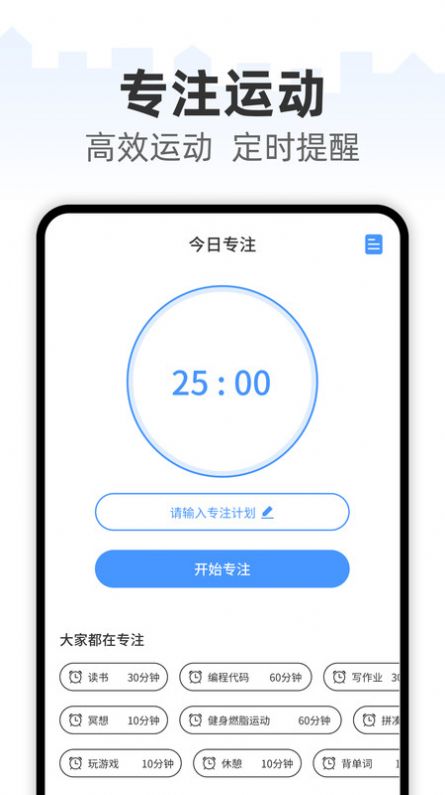 可设置每天运动时间提醒,完成标题关键词编辑并开始专注运动。