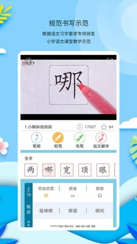 4、规范字教学:与语文教材同步,每一个字都有三笔字讲解示范,20000个教学微视频;130000多张古今书法家书法高清欣赏。