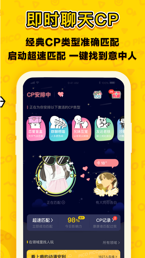 PicoPico,在这里有着很多种交友互动的方式,可以满足你的所有交友需求的,其中还有很多的互动小游戏,可以帮助你快速的拉近彼此之间的距离的,同时系统会根据你的交友标签给你推荐合适的异性朋友的,帮助你在最短的时间内完成脱单的。有需要的朋友,可以下载体验一下的。