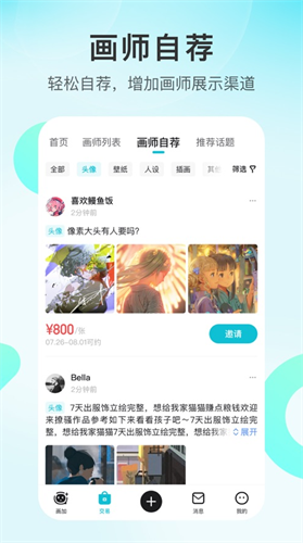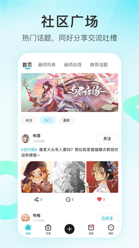 画加这里的绘画社交约稿交流平台资源更为丰富,还有大量神仙大佬们邀你一同来学习和鉴赏,超多的作品资源和各种各样的对象进行轻松沟通,超多的vip约稿资源和情况都十分的丰富,拒绝盗图以及多种保障的作品资源都十分丰富,线上作品删除资源都十分轻松,线上超多的沟通交流资源更加多样化,简单可靠的社交约稿模式值得一试。