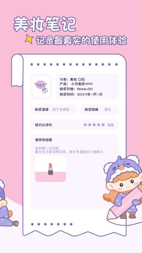 1、可以对个人使用各种美妆产品的体验进行实时的记录,还能将其分享给你的好友一起进行查看