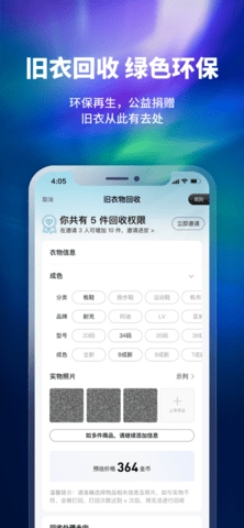 1、一键置换:旧衣拍照上传,工作人员上门回收,一键旧衣换新衣。