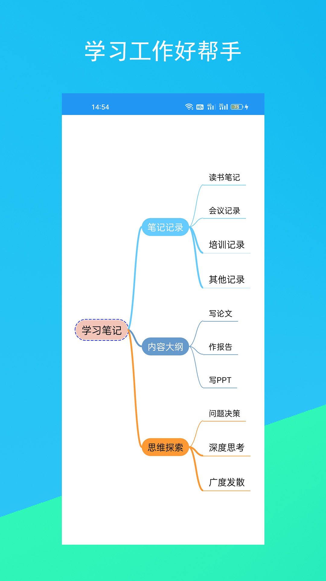 思维脑图这款软件极大的帮助学生和用户们对于学习以及未来的规划制定,将所有的路线都布置的非常完善,朝着人生的下一个目标前进,强力的思维导向功能更可以激发学生们的开发能力,极大的潜能完全超乎你的想象,思维导图布局的UI设计更是可以自行更换,在查找目标点还是直观的效果同时都完全不需要收费。