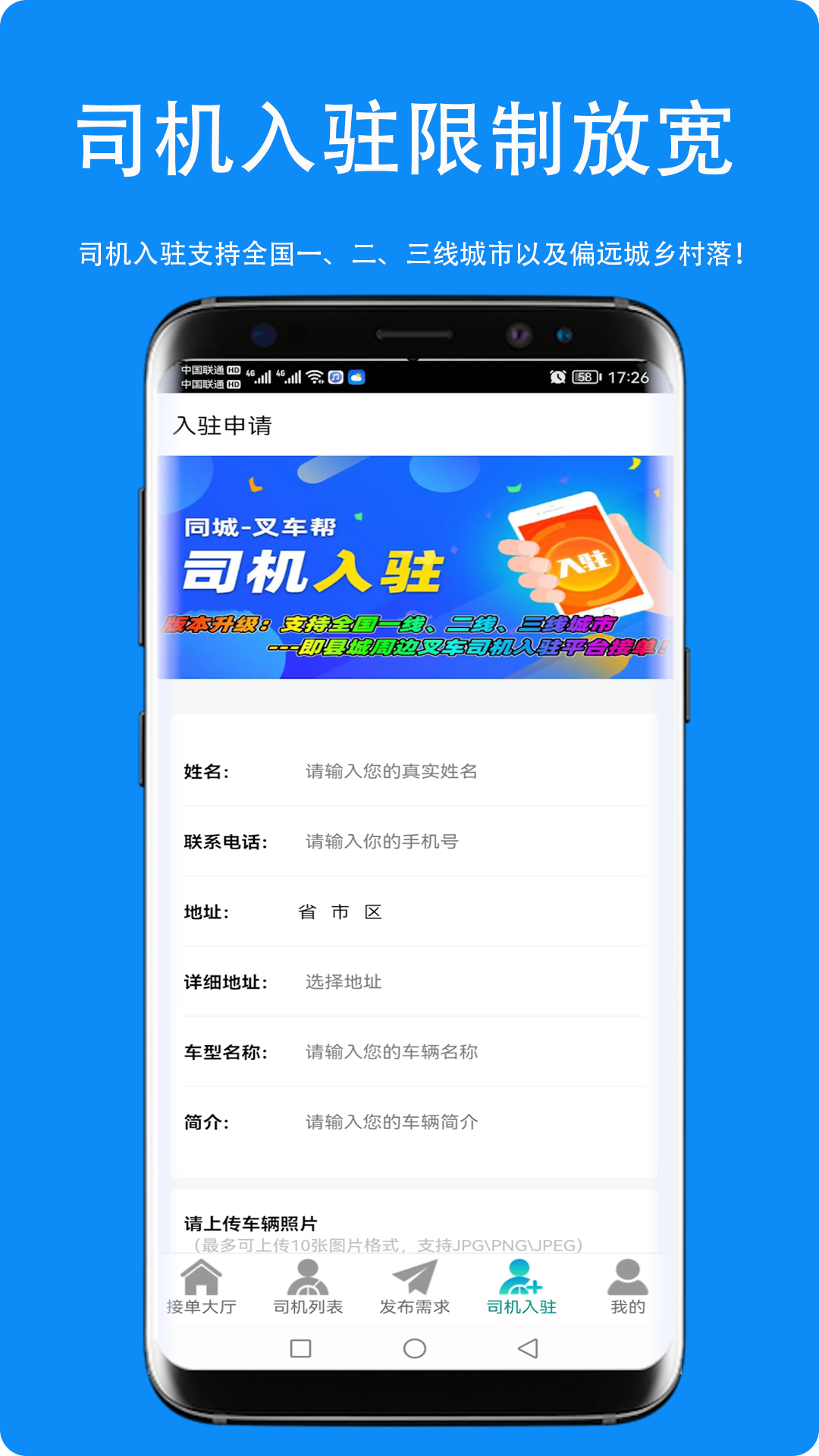 同城叉车帮是一款专为叉车司机师傅提供的同城附近接单抢单服务平台软件,使用这款接单叉车软件的司机需要完成个人信息的注册来享有平台的接单广场,可智能定位你当前所在的城市地区来提供单子工作资源,拥有非常好的抢单和工作流程,让每位师傅都能高效率的工作。
