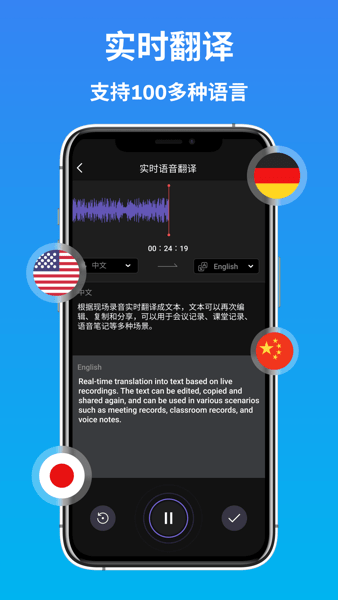 AI语音翻译这款自动翻译语音和文字的软件完全让用户的工作效果和学习效率提升一个台阶,不仅所有功能都是免费的,还能够将翻译出来的文字进行导出,各种各样的格式都是支持的,只为给用户们最为便捷的效率方案,ai自动识别的同时还会进行美化,让语句能够一翻译出来就用,是一款无比高效率的软件,有需要的小伙伴们快来下载试试吧。