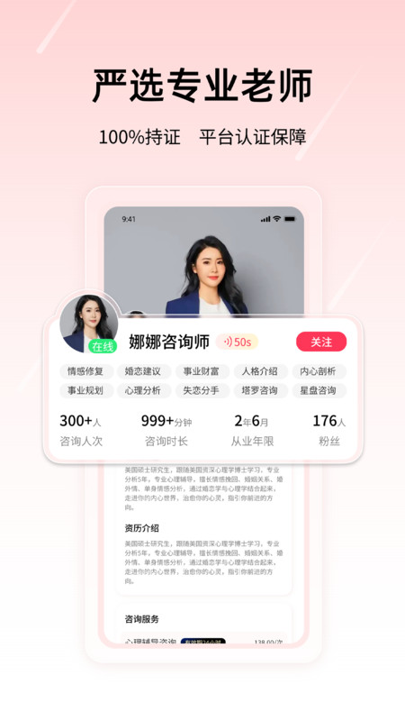 1、咨询师会针对每个用户的独特情况,提供量身定制的咨询方案;