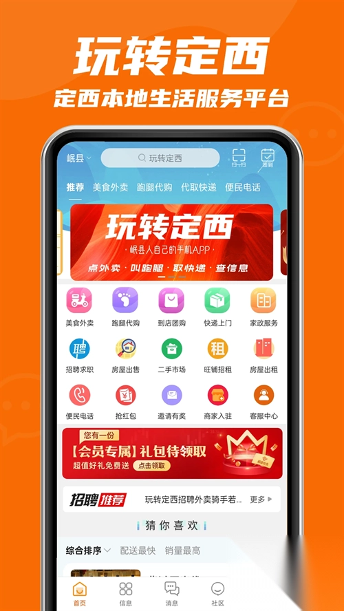 玩转定西App,是定西市专属的数字综合生活服务平台。这款软件集成美食外卖、跑腿代购、快递代取、超市便利、政务服务、便民信息等多项业务,在一方小小的屏幕里,就能满足本地居民与商家在衣食住行、吃喝玩乐购等方面的多元需求,让生活更加轻松无忧。