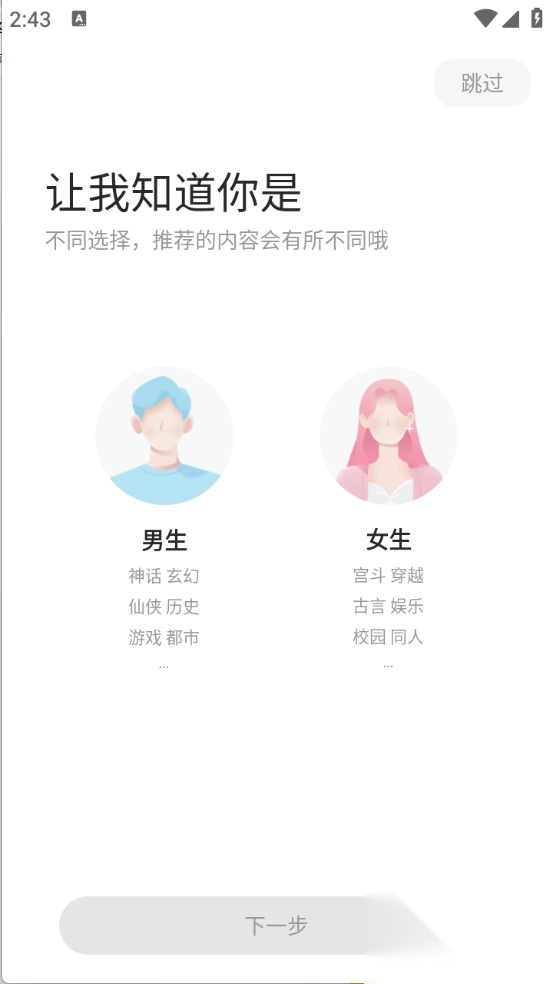 1、下载安装后,选择性别即可获得精准书单推荐。