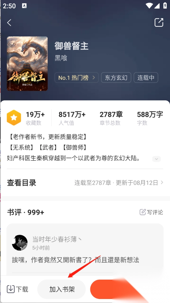 2. 你能看到“加入书架”按钮,点击它。随后,返回首页,找到“书架”按钮并点击,如此便可随时翻阅。
