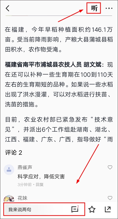 2、当您进入新闻页面后,点击右上角的【听】图标,就能收听该新闻。对于那些希望更深入了解新闻的朋友们而言,这种方式更为适宜。因为通过此方式,他们不仅能够一边阅读新闻,一边收听,还能在评论区与其他用户展开探讨。