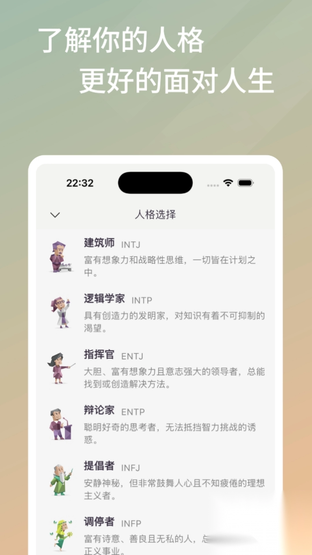 3、提供多种人格类型的详细描述,根据自身性格特征选择对应的人格,辅助进行自我认知与探索,丰富功能维度。