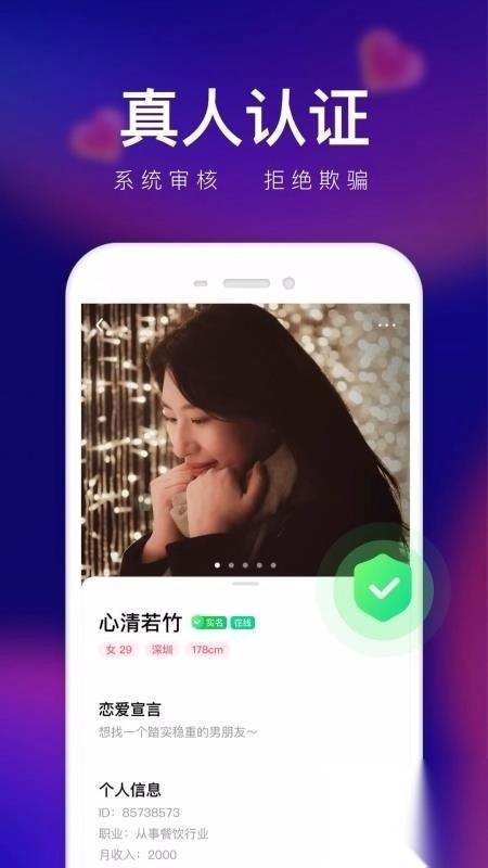 在此,平台对每一位用户均进行了实名制真人认证,您可放心交友。