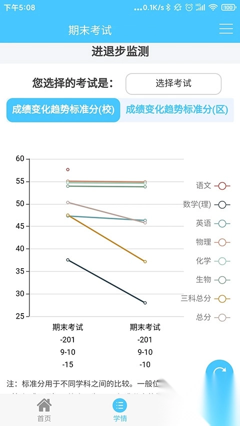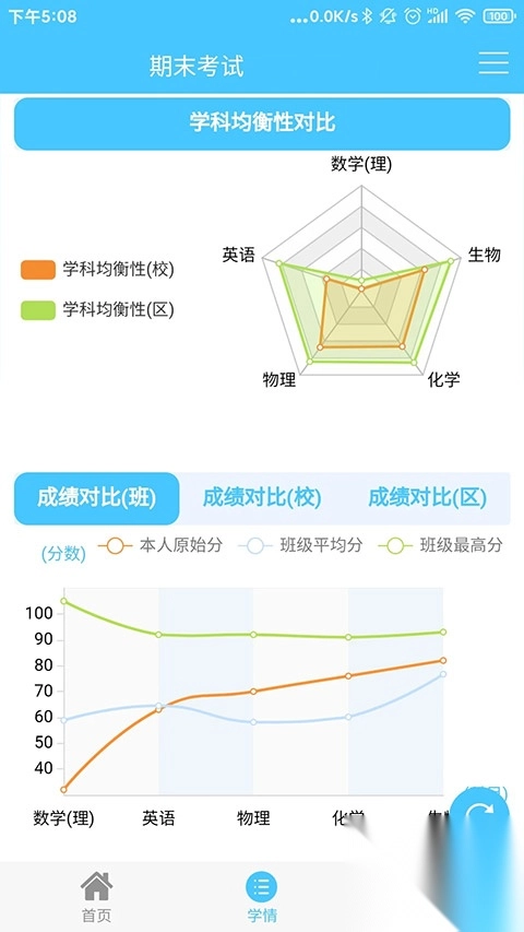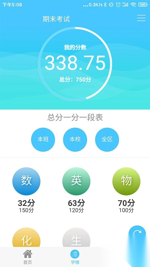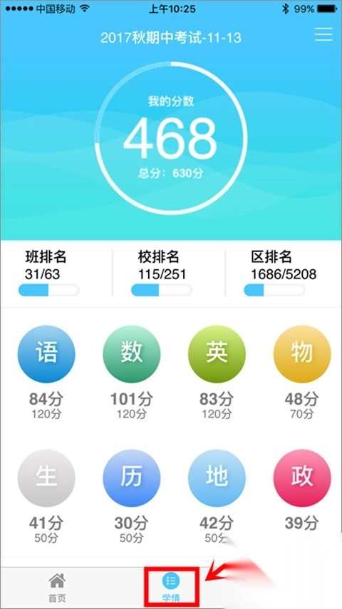 4、用户绑定学校并登录进入首页后,点击底部“学情”,就能查看学生各科目考试成绩。