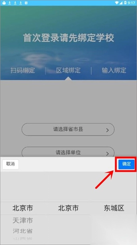 3、首次登录需要先绑定学校,绑定方式为扫码、区域选择和输入绑定;