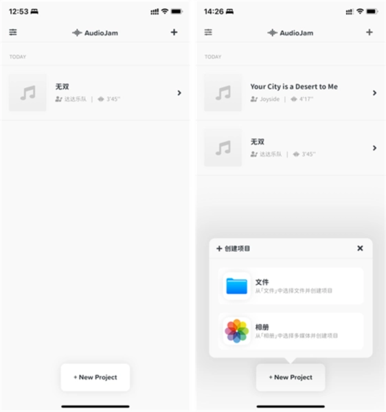 2.、首先就是打开App然后点击「+」来创建一个项目,这里需要从「文件」中导入一个音频文件,支持.mp3、.m4a、.aac、.AIff、.wav格式的音频文件以及.mp4、.mov格式的视频文件。选择导入后,会将其创建为一个工程项目,我们可以看到音频文件已经完成导入,并可以在播放控制页面中看到生成的对应波形。
