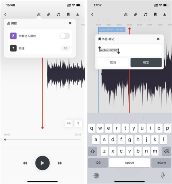 设置音频的起始点与结束点,持续进行AB循环重复播放。