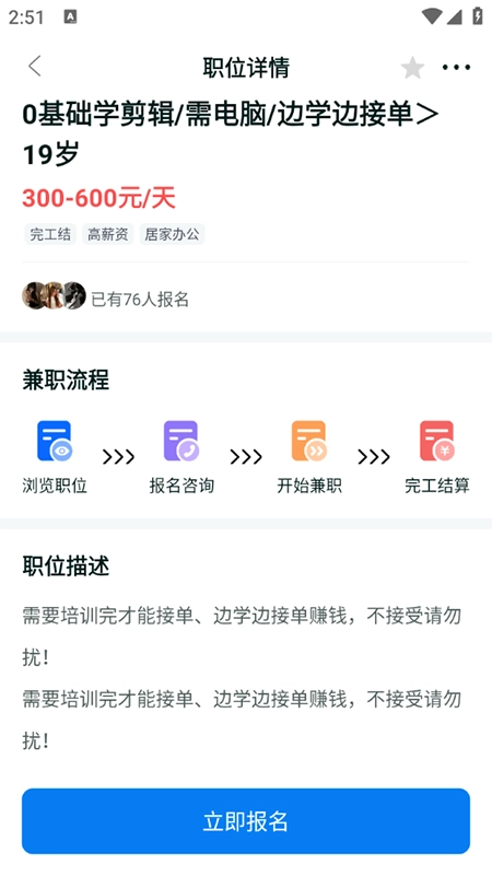 2、点击岗位详情页“立即报名”,等待招聘方回复;