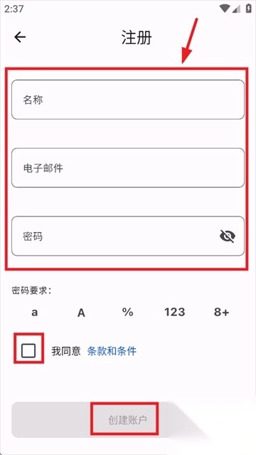 4.勾选“同意用户协议与条款”。最后,点击“创建账户”按钮,至此注册完成。