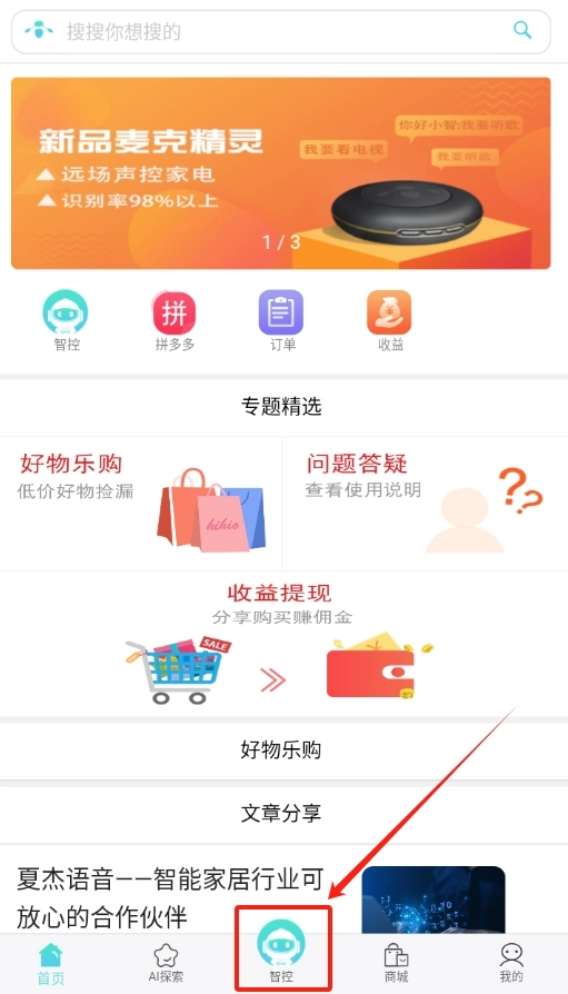 1. 当成功下载并打开夏杰精灵后,于软件底部的一排功能栏里,找寻十分醒目的 “智控” 按键,点击该按键即可进入智控页面。