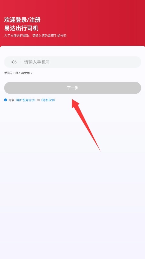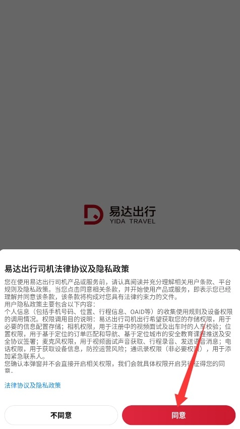 1. 开启易达出行司机端APP,认真研读用户协议及隐私条款,随后点击同意,进入注册页面。
