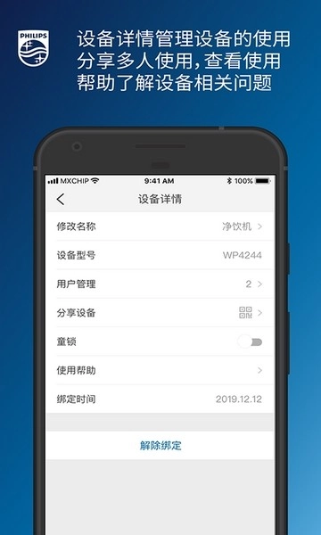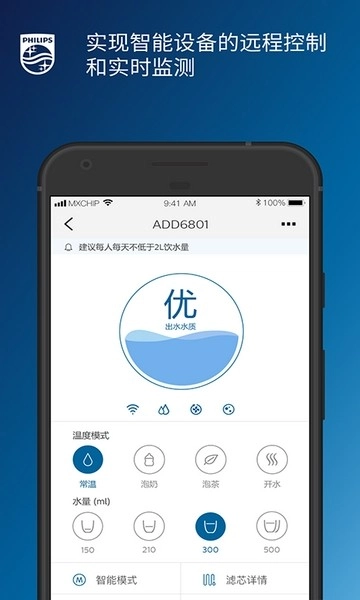 飞利浦水健康APP支持飞利浦净水器、净饮机、热水器、智能马桶等智能物联设备的统一管理和智能操控,一个APP集成全屋的智能水生活系统,用户可以通过APP远程监测和智能控制,随时随地监测设备的使用情况、使用数据,并进行远程的操作和设置,智能、安全、舒适、健康,全面保障用户高品质的智慧居家生活体验。